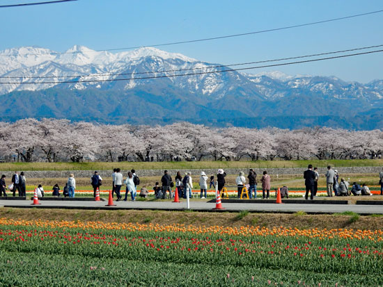 後立山連峰を背景に・さくら・菜の花・チューリップの四重奏
