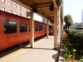 | 高岡駅で待機の氷見線を走る「忍者はっとりくん」号 |
