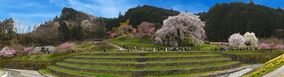 | 又兵衛桜 マップ 令和6年4月5日 宇陀市の一本桜で 樹齢約300年のシダレ瀧桜 大坂の陣で活躍した戦国武将後藤又兵衛が豊臣家崩壊後この地で暮らした その時の後藤家屋敷跡にある パノラマ画像 |